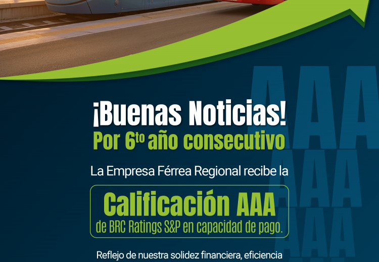 (Cundinamarca, 9 de octubre 2025). Por sexto año consecutivo, la Empresa Férrea Regional S.A.S. ha recibido la calificación (AAA) de BRC Ratings S&P, un hito que consolida nuestra solidez financiera y operativa. Esta distinción se traduce en la menor expectativa de riesgo de incumplimiento de nuestras obligaciones.